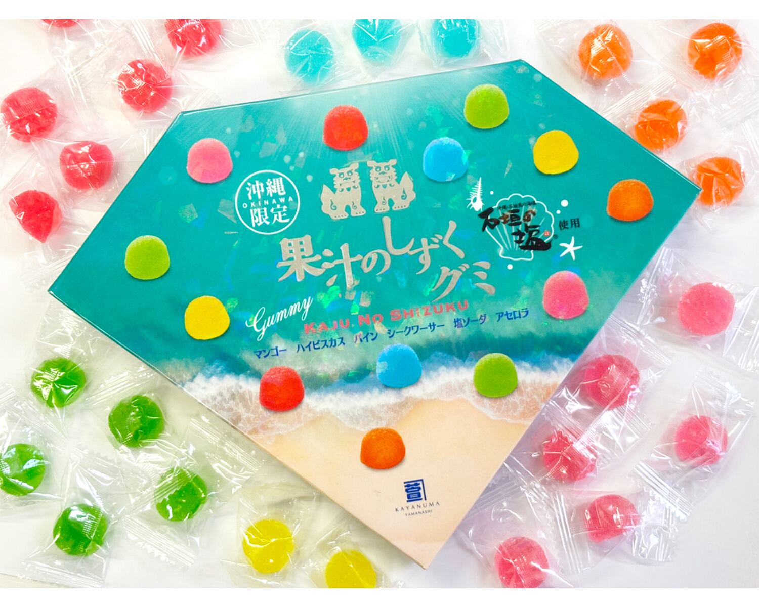沖縄限定!「山梨限定 果汁のしずく」で超有名な萱沼製菓さんと当店Lokahi(ロカヒ)がコラボした新商品です!沖縄県産の果汁を使用、また 沖縄・石垣島の海塩「石垣の塩」を使用した沖縄を代表するフルーツのグミです【マンゴー ハイビスカス パイン シークワーサー 塩ソーダ アセロラ】の沖縄感じる6種類の味が楽しめます