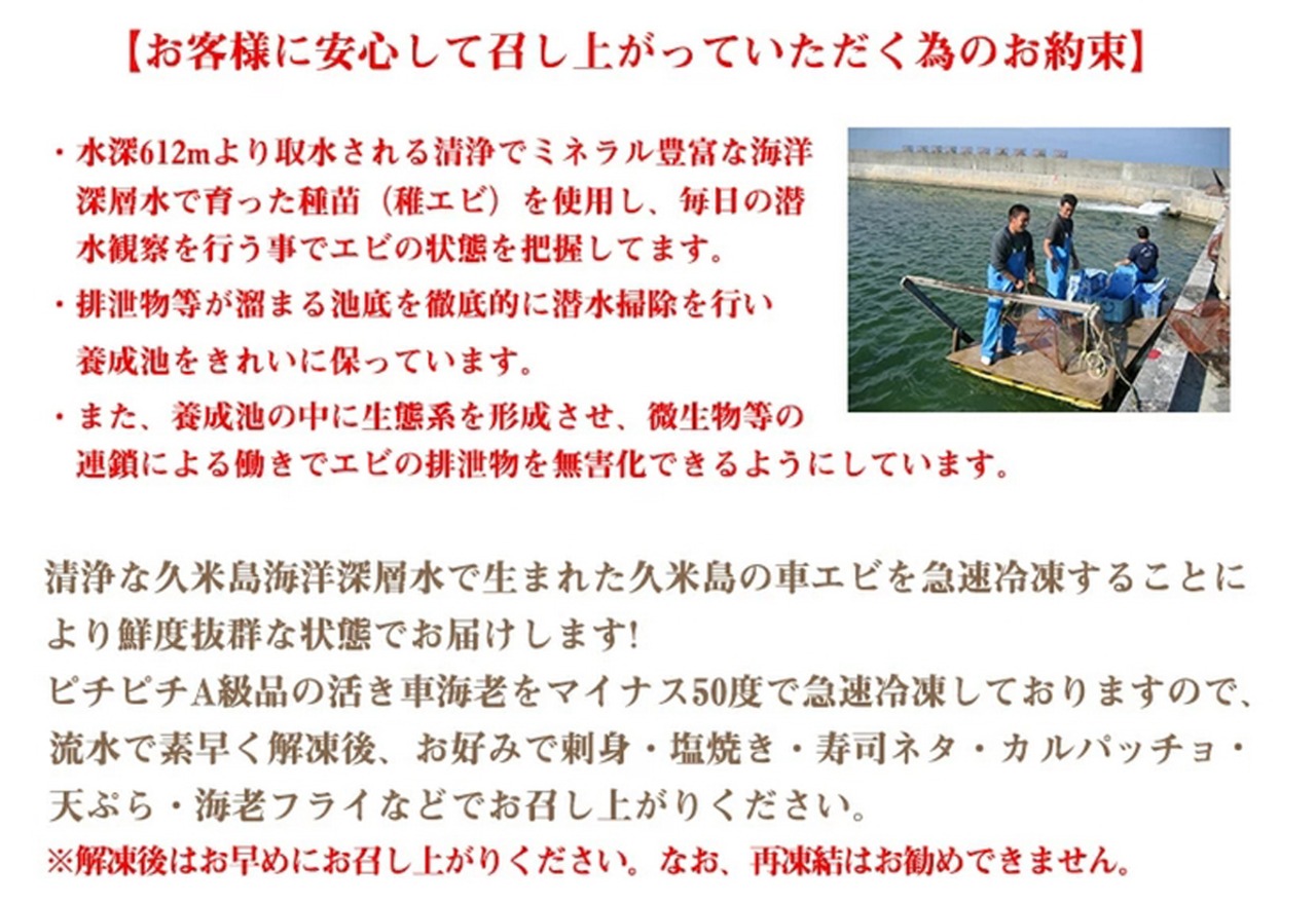 車えび日本一の生産量を誇る沖縄県久米島(沖縄本島から西方100km離れたところにある自然豊かな島)より、鮮度抜群ピチピチA級品の活き〆車海老をお届け!ジューシーな甘さがやみつき!活き〆マイナス50℃で急速冷凍!お届け後解凍してもぷりっぷり♪解凍後お好みで刺身・塩焼き・寿司ネタ・カルパッチョ・天ぷら・エビフライなどでお召し上がりください!
