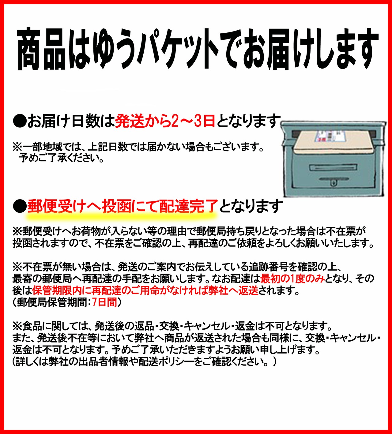 ※システムの仕様上、購入者情報の入力時に配送日が選べるようになっておりますが、ゆうパケット便(ポスト投函で配達完了)で発送となり数日のズレが生じるためお約束できかねます。予めご了承ください。