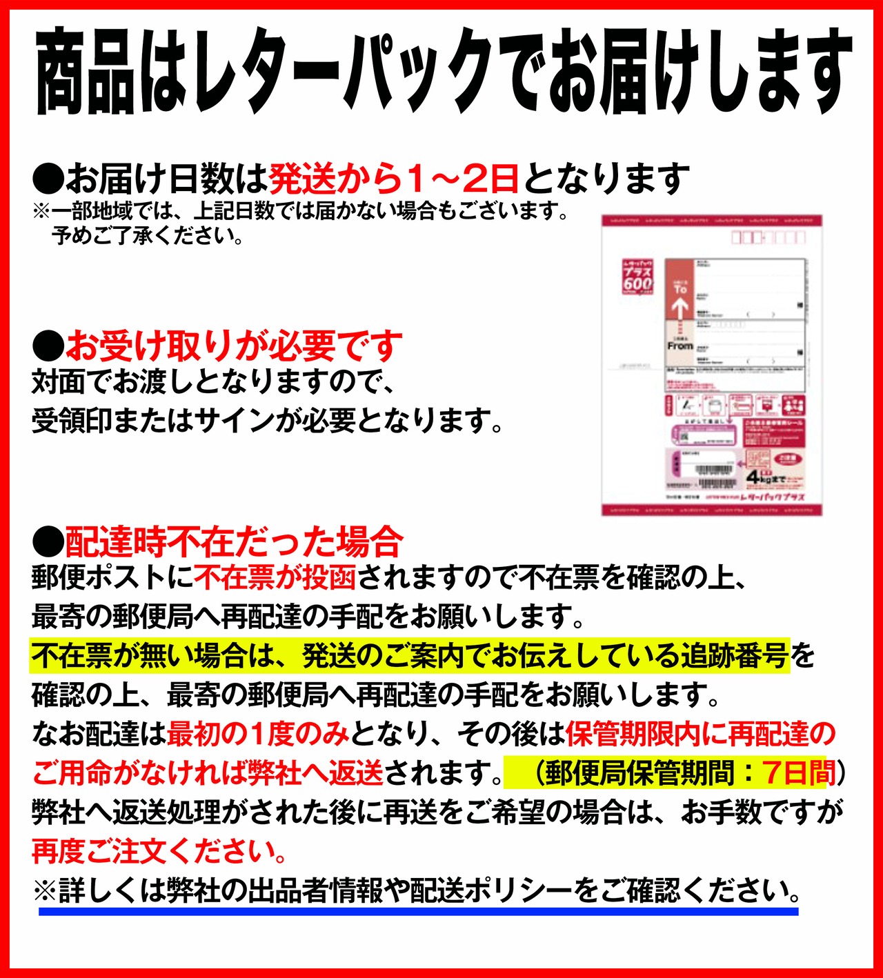 ※この商品日本郵便のレターパック便での配送となります。対面受け渡しとなりますが日時指定はご利用頂けません。予めご了承ください。