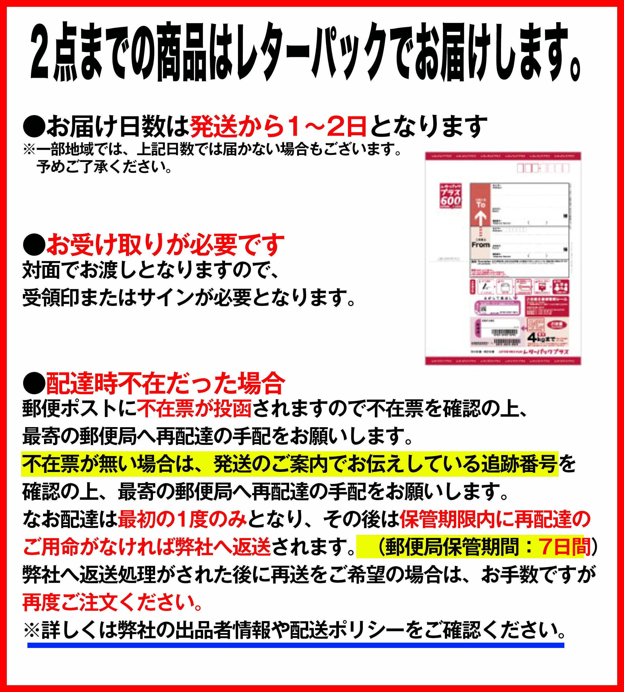 こちらの商品はレターパックプラス(対面受け取り)にて発送致します。日時指定はご利用いただけません。予めご了承ください。