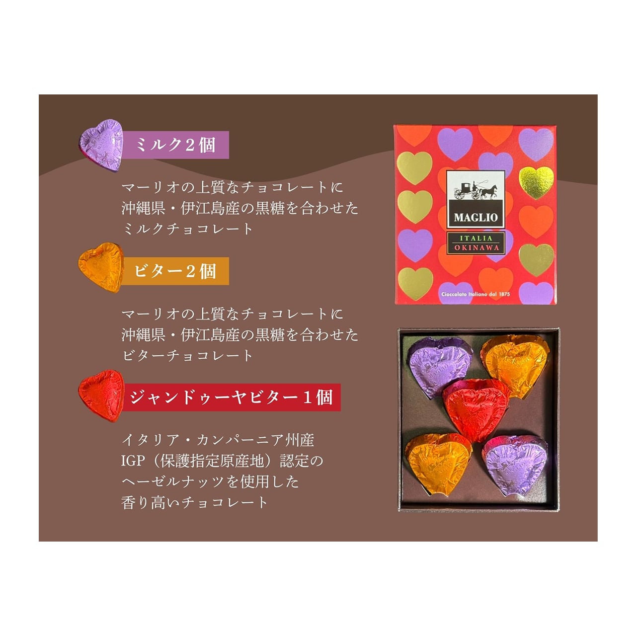 高級 イタリア マーリオ チョコレート『 ハート型ギフト 』 2箱 (1箱5個入 ミルク味2個・ビター味2個・ジャンドゥーヤビター味1個 ) 沖縄とイタリアのコラボチョコ ※冬季限定※ (※ご注文日から1~3営業日で発送いたします)