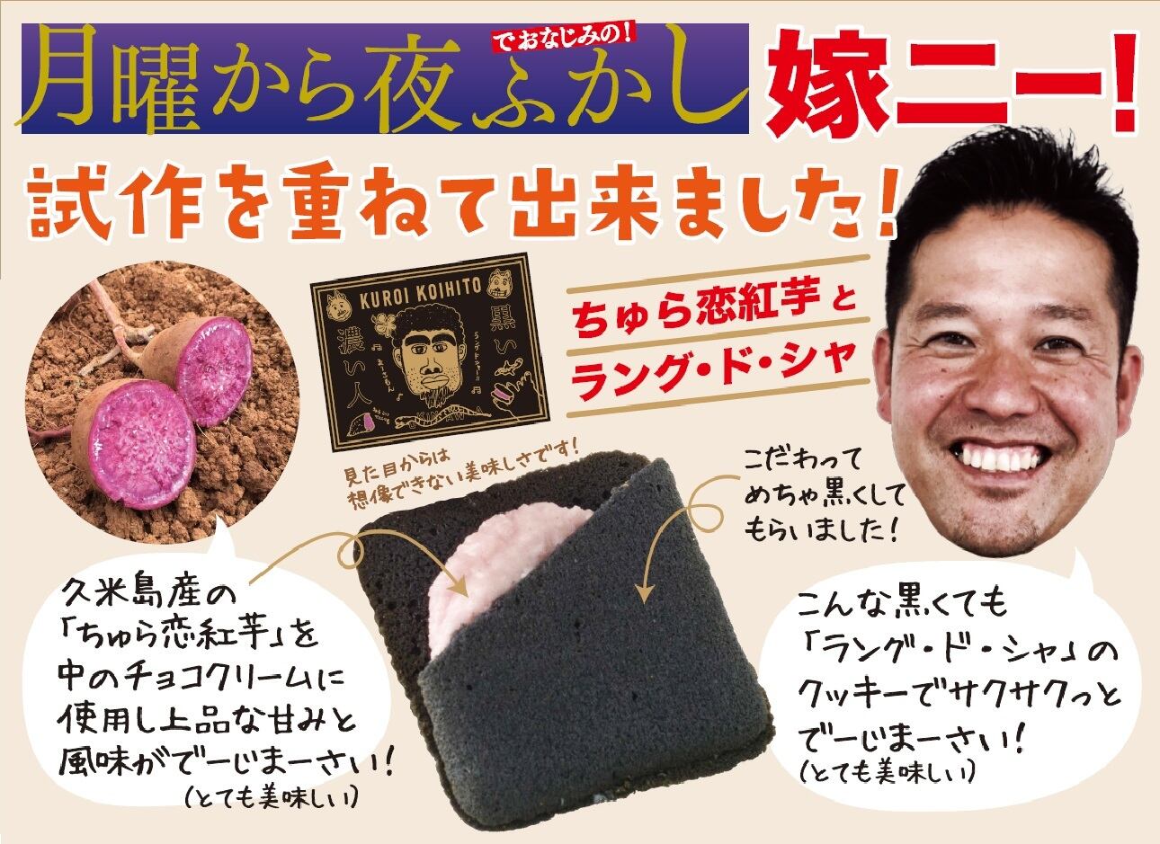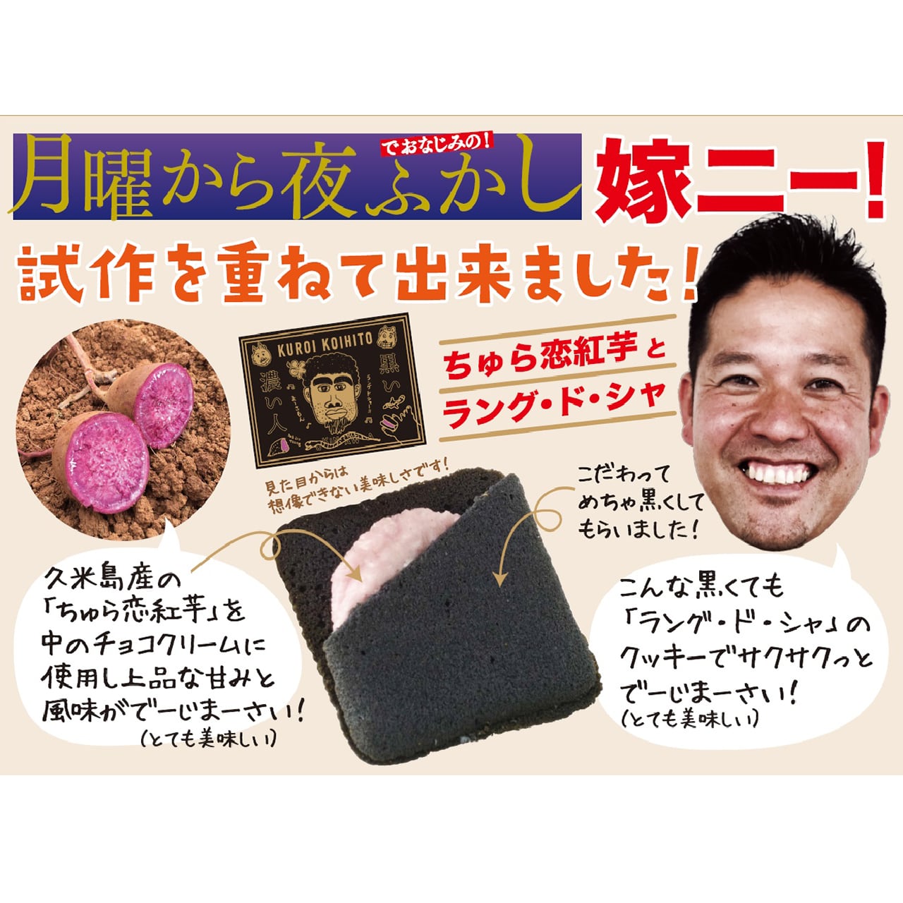 ◆毎週月曜深夜放送の大人気番組に何度も出演!人気となった『嫁ニー』こと平良司さん! 嫁ニーが考案したお菓子、ラングドシャがついに発売になりました!