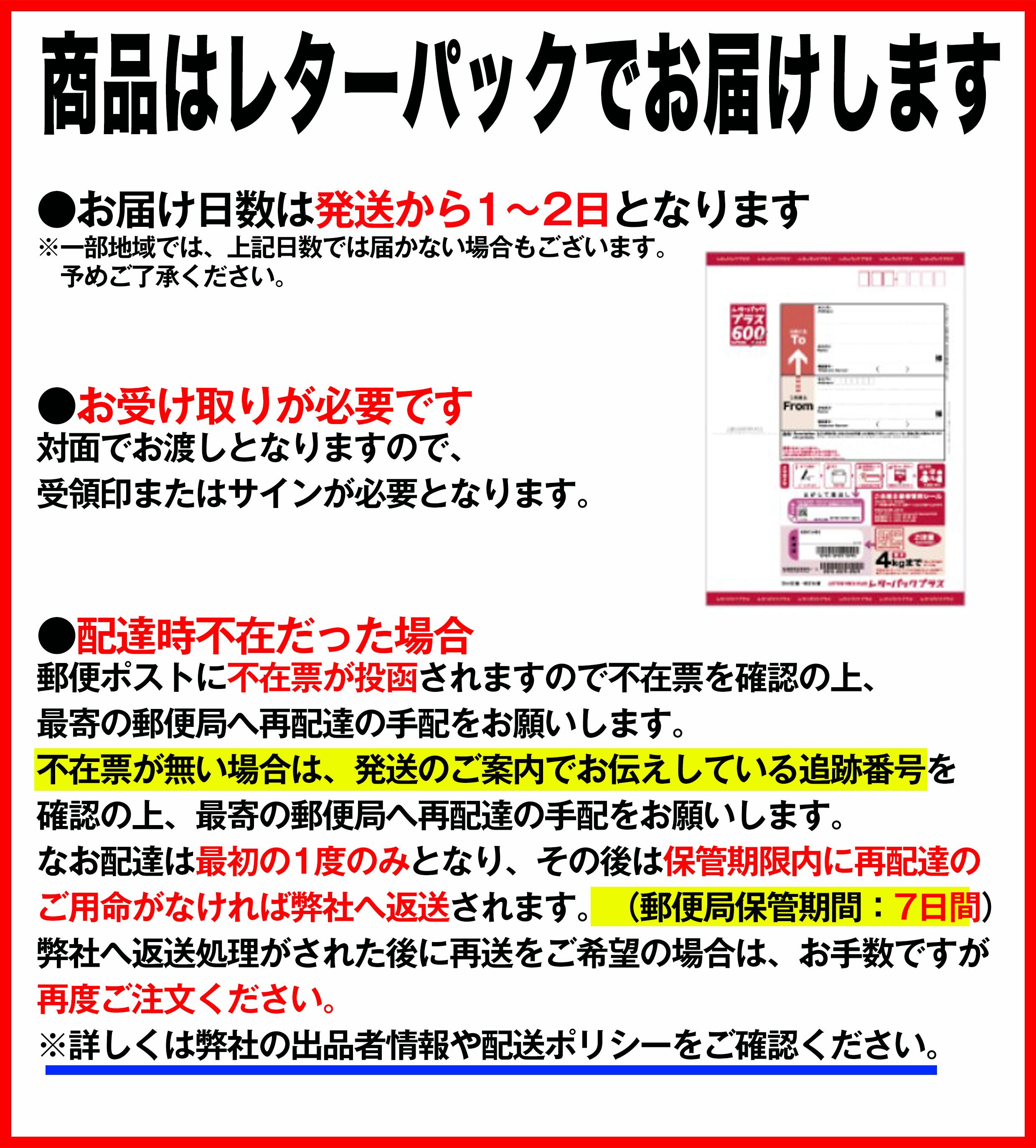 ※この商品は配送料金を可能な限りお安くお届ける出来るよう、レターパック便での配送となります。対面受け渡しとなりますが、日時指定はご利用頂けません。予めご了承ください。