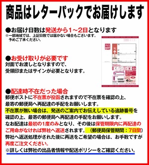 ※この商品は配送料金を可能な限りお安くお届ける出来るよう、レターパック便での配送となります。対面受け渡しとなりますが、日時指定はご利用頂けません。予めご了承ください。